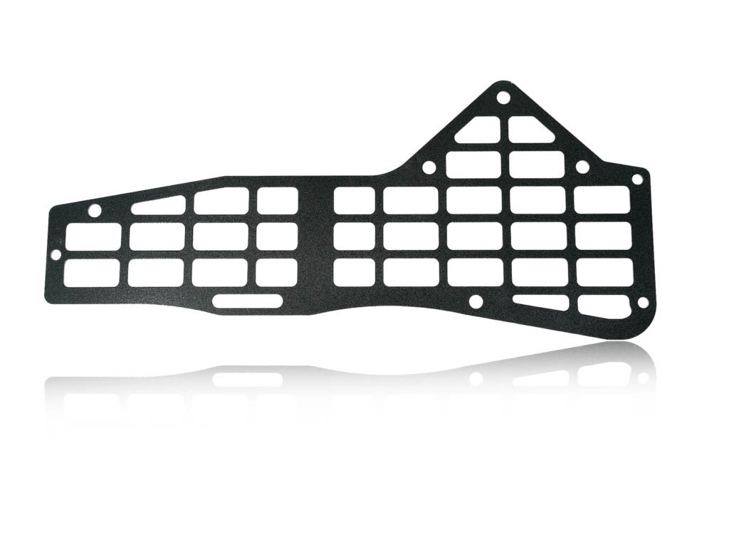 Our center console MOLLE systems are custom designed and laser-cut, providing a bent to perfection, seamless fit that's sure to impress. We also powder-coat it in a durable black semi-gloss mini texture to protect against corrosion, as well as anything else Mother Nature might throw at you. it's not only strong, but it's also lightweight, which makes it incredibly versatile while out off the beaten path.