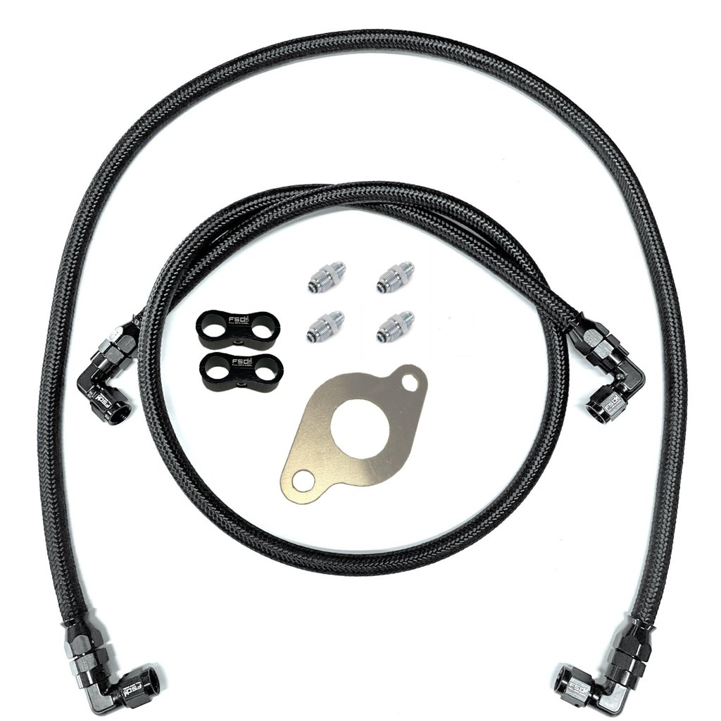 Replace your leaking Powersteering lines and clean up your engine bay with Full Send Diesels Powersteering hose kit. Our kit is made from high pressure PTFE black braided AN hose and forged AN hose ends. Not only will this kit replace your factory lines that may be leaking, but it also reroutes them down to the frame rail to add a custom look to your engine bay.