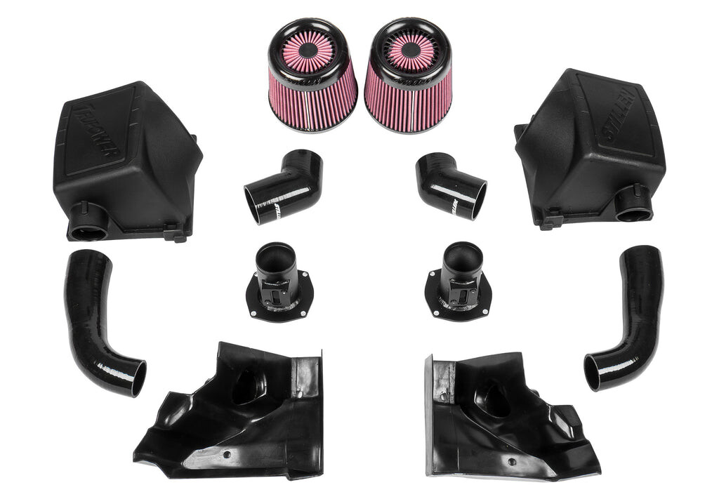 The TruPower by Stillen cold air intake includes two replacement intake scoops and ducts, channeling truly fresh cold air from the front of the vehicle through the truck's core support into a larger airbox. This design maximizes the factory intake opening as well as a secondary air source, providing nearly 50% more airflow through the true cold air intake port.