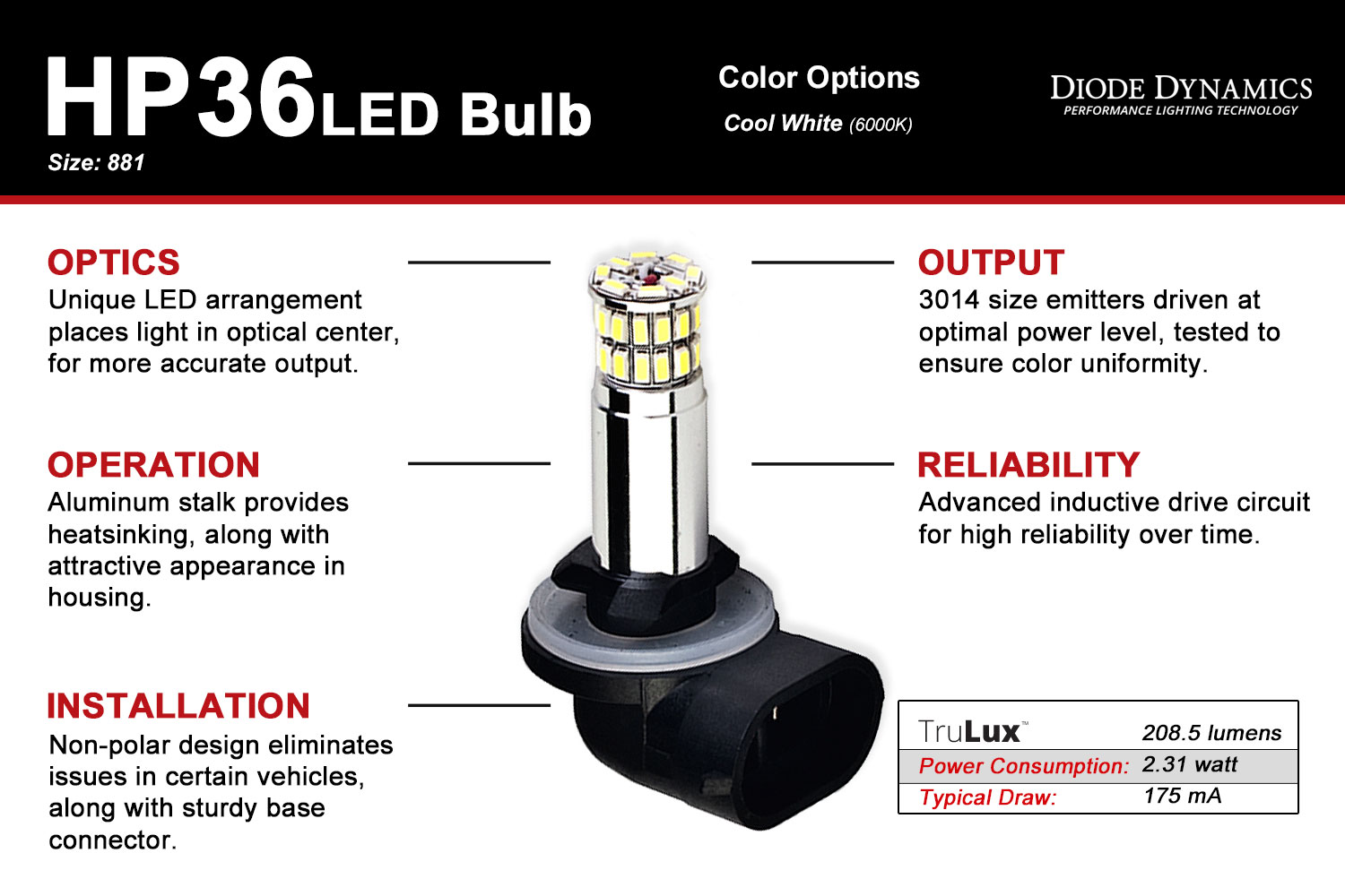 Upgrade. Add a modern appearance to your vehicle with the 881 HP36. Populated with 36 high-power 3014 size LEDs, the HP36 illuminates a full 360 degrees. Housed in an aluminum stalk for superior heatsinking properties, the HP36 will last for years to come. Best of all, installation only takes minutes - simply take out your factory bulb and the HP36 will fit snugly in the socket.