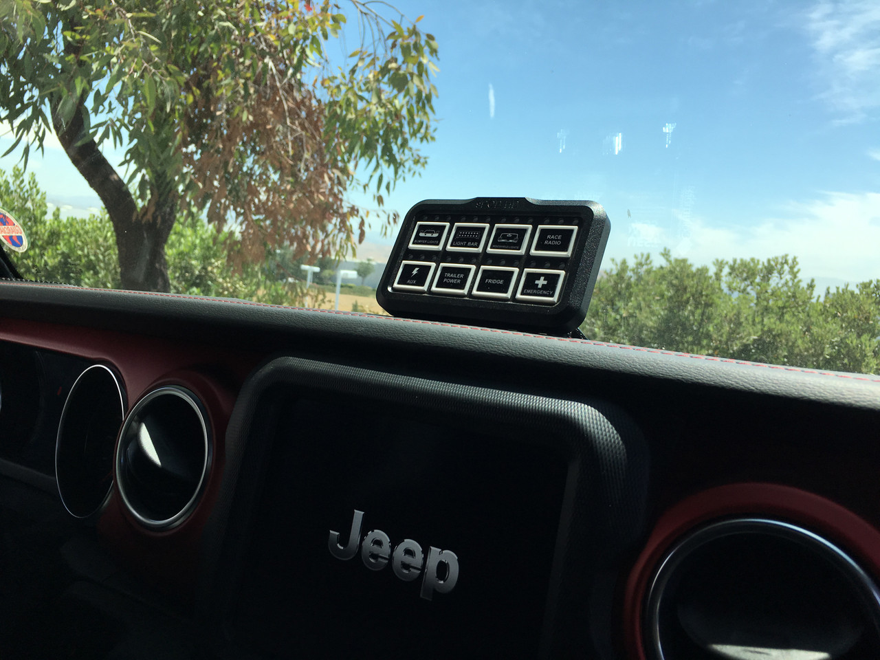 - Each switch has 3 status lights: Red (left) = On, White (center) = Flash/Strobe active, Blue (right) = Active visual feedback when button is pushed.