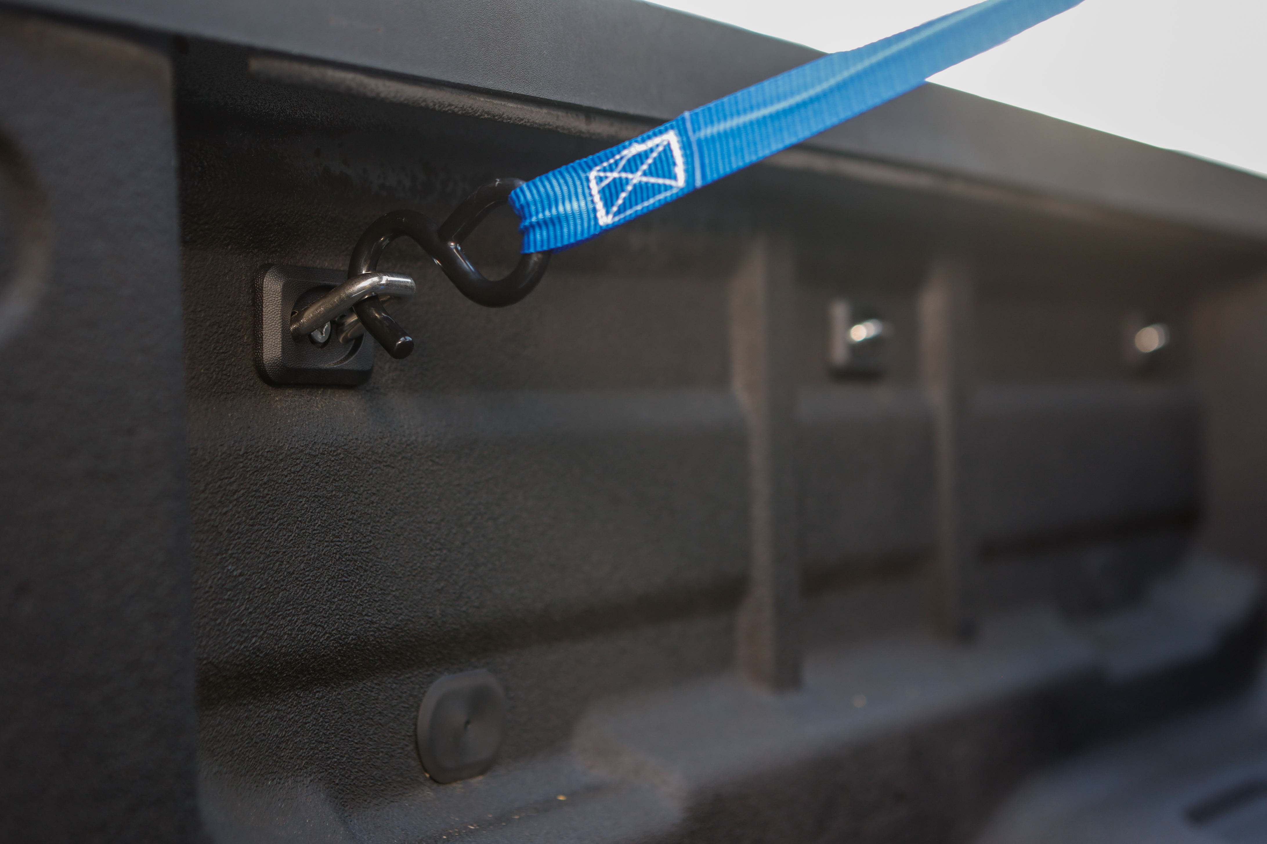 The retractable anchor ring lifts up and out at a 35 degree angle to match the angle used when securing loads with ratchets or rope, then hit it down flush when it's not in use.