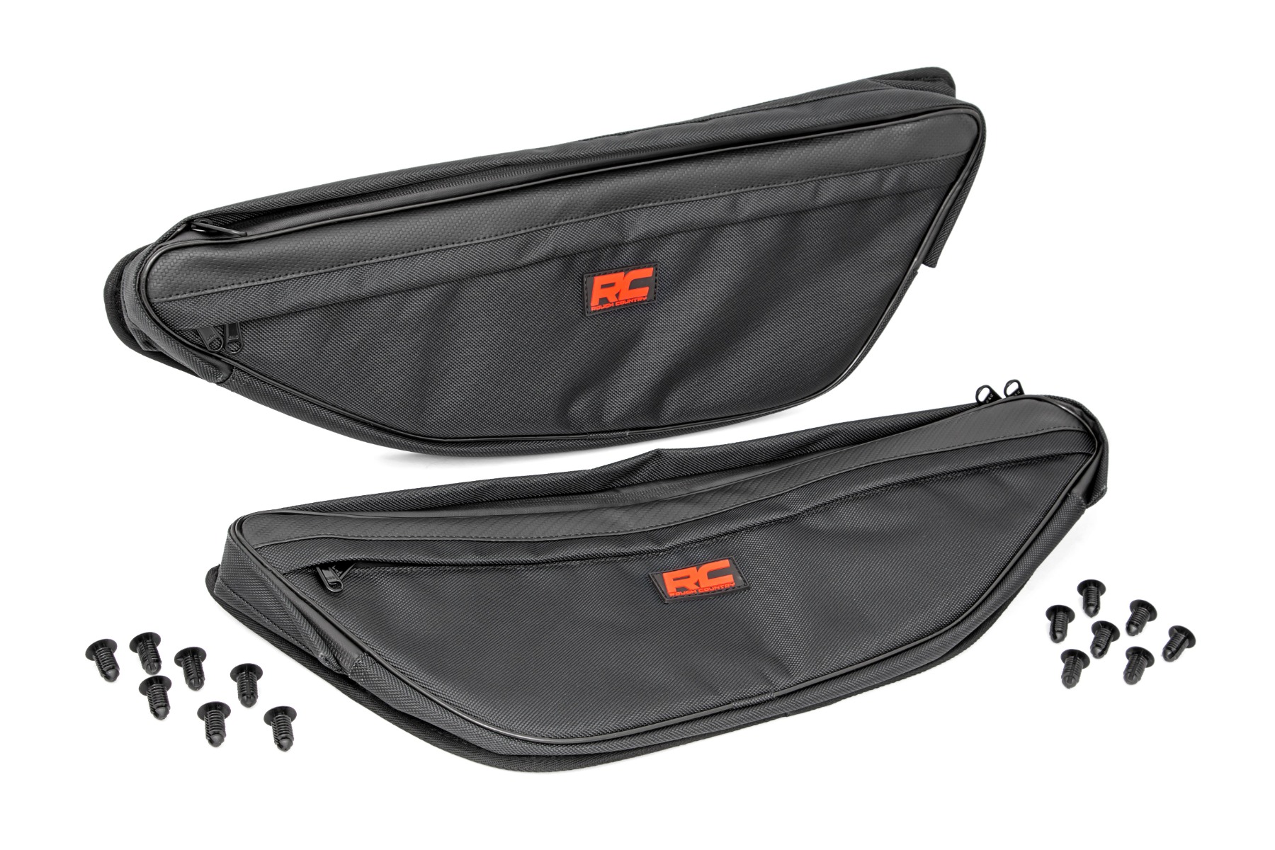 Durable Construction. Rough Country's Front Door Storage Bags are constructed of high-density water, dust, and scratch-resistant 1680D Oxford nylon fabric. This convenient storage option sits prominently on the doors of your UTV offering ease of access to your stored goods.