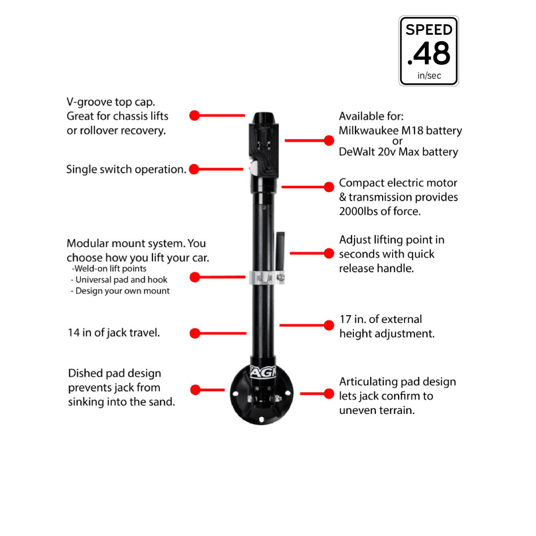 - Jack and components are sold A La Carte, so you can build exactly what you want. Accessories are sold separately, including Batteries! This is a modular system so feel free to purchase the Weld-On Jack points or make your own attachment tool for the jack.