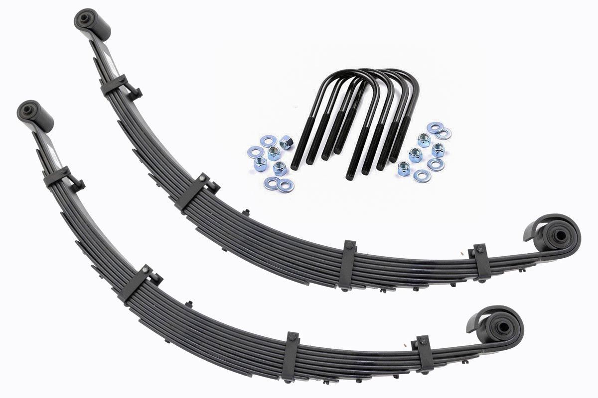 Durable and Off-Road Ready. Rough Country's Replacement Leaf Springs are designed to tackle any terrain that they are faced with. Featuring a multi-leaf design and spring pads this reduces the friction and maximizes comfort. Each leaf pack utilizes tapered leaves for improved flexibility at their ends.