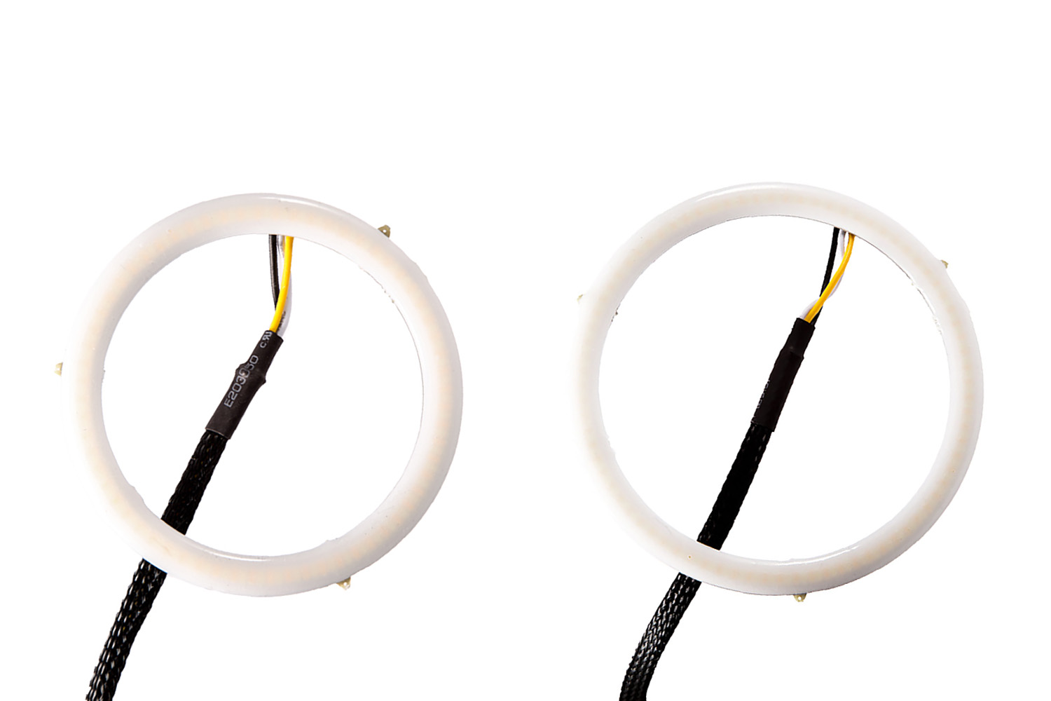 All input wires activate the halos, at different brightness levels. All amber-colored halos ship with low priority drivers. This means that if both low and high power inputs are powered, the LED will light up with low power level. This is convenient for connecting the red wire to a parking light or DRL signal, for use during the day as a high-power DRL. Then, if the white wire is connected to the headlamp power, they will dim down at night. If the yellow wire is powered at any time, the halo will light up at 200 percent brightness momentarily, intended for signalling (dims automatically if powered for more than two seconds).