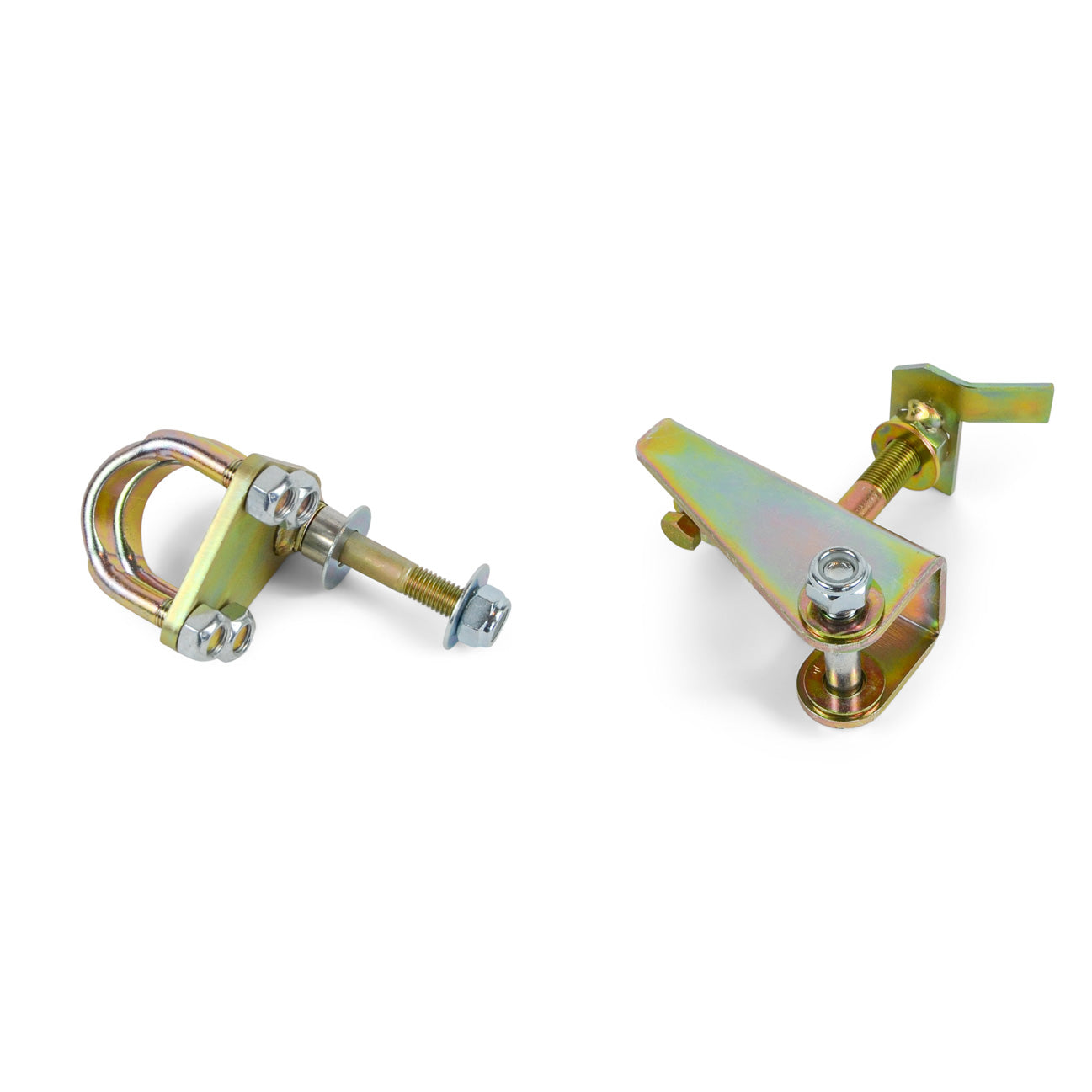 This is a simple bolt on 3/16s thick, gold zinc plated, double sheer bracket. It includes Grade 8 Hardware to properly clamp our new CNC laser cut and bent bracket to your factory axle mount.