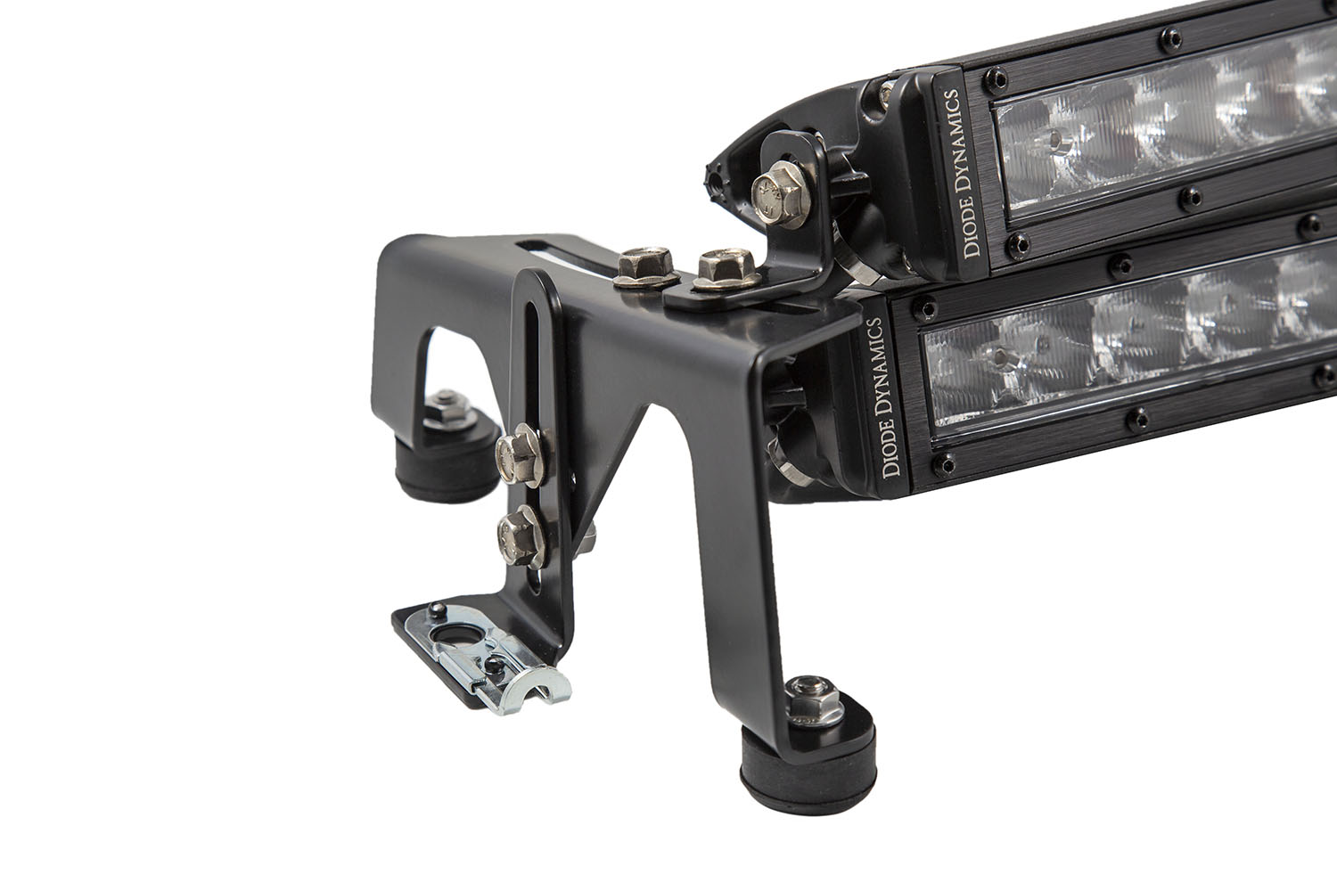 Designed for racing. The Motorsports LED Light Bar Kit from Diode Dynamics allows you to mount up to four SS12 Stage Series 12 Inch Light Bars or SS18 Stage Series 18 Inch Light Bar on the hood of your vehicle. The whole kit includes everything needed for installation and uses stainless steel hardware for long lasting durability, including custom-made stainless rubber bumpers, which absorb vibration and prevent any damage to the hood. These purpose-built brackets were CAD-designed to provide the performance you need to Go Faster, and See Further.