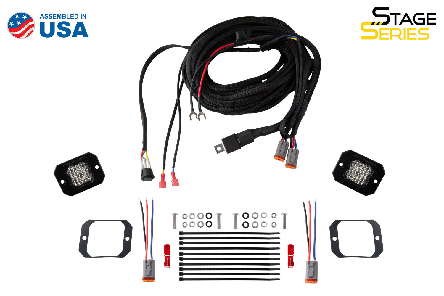 Overview. Add significantly more light output when backing up at night with our Stage Series Flush Mount Reverse Light Kit! This kit allows you to mount two flush mount SSC1 or SSC2 LED pods in your rear bumper adding a high-power reverse light along with a red accent light. With the included wiring harness this kit connects to your vehicle's wiring for simple everyday operation.
