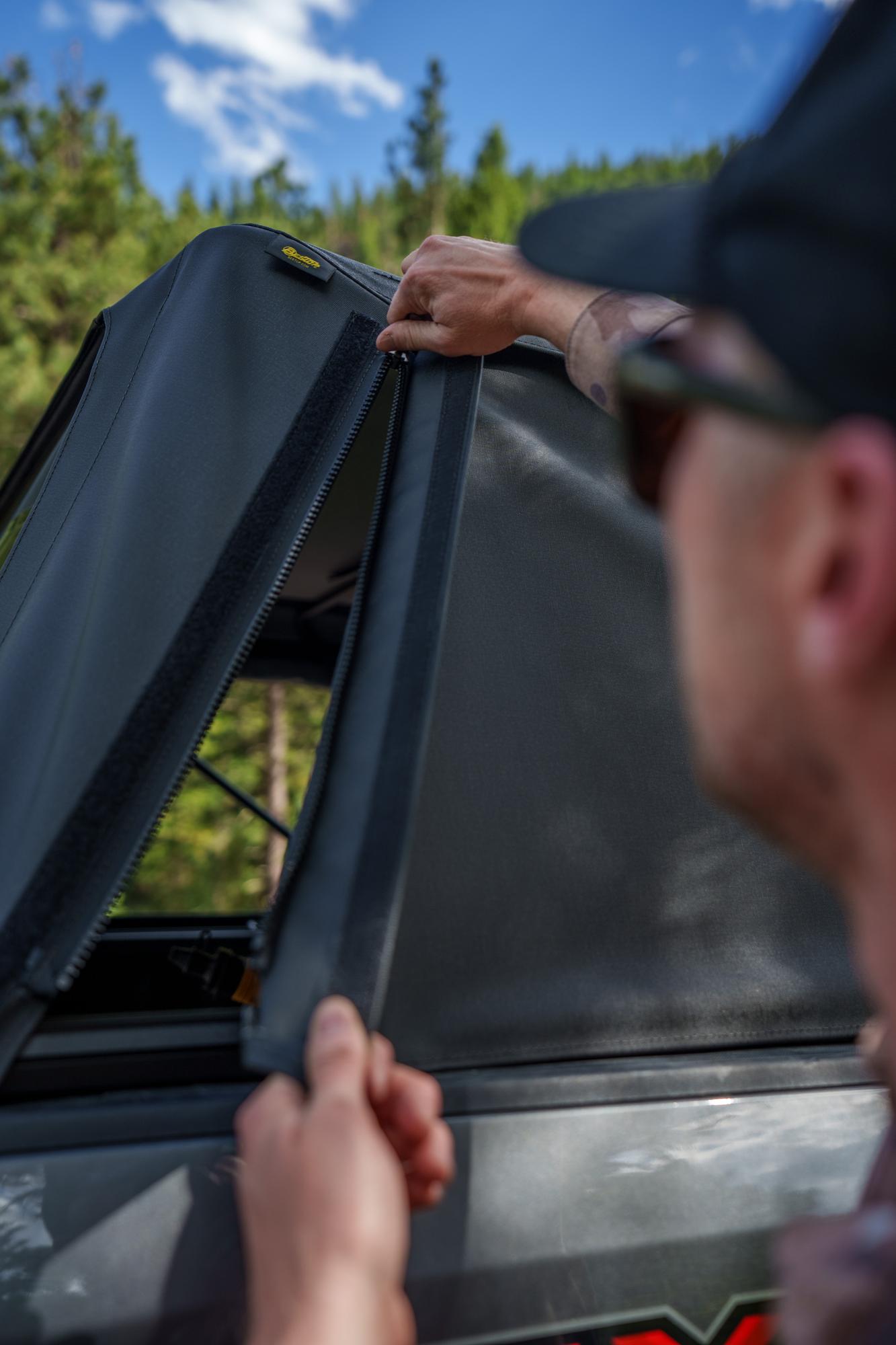 - Removable side window panels which roll into storage pocket