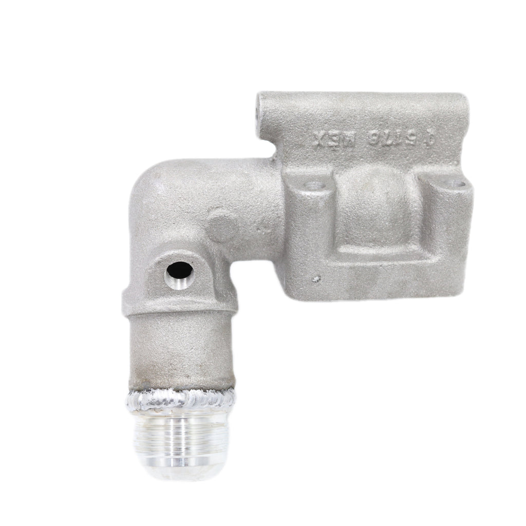 Looking to plumb your upper radiator hose out of -20AN Braided Hose? Look no further then FSD's fabricated aluminum upper coolant neck. This is a cast aluminum coolant neck modified to adapt to a -20AN Hose.
