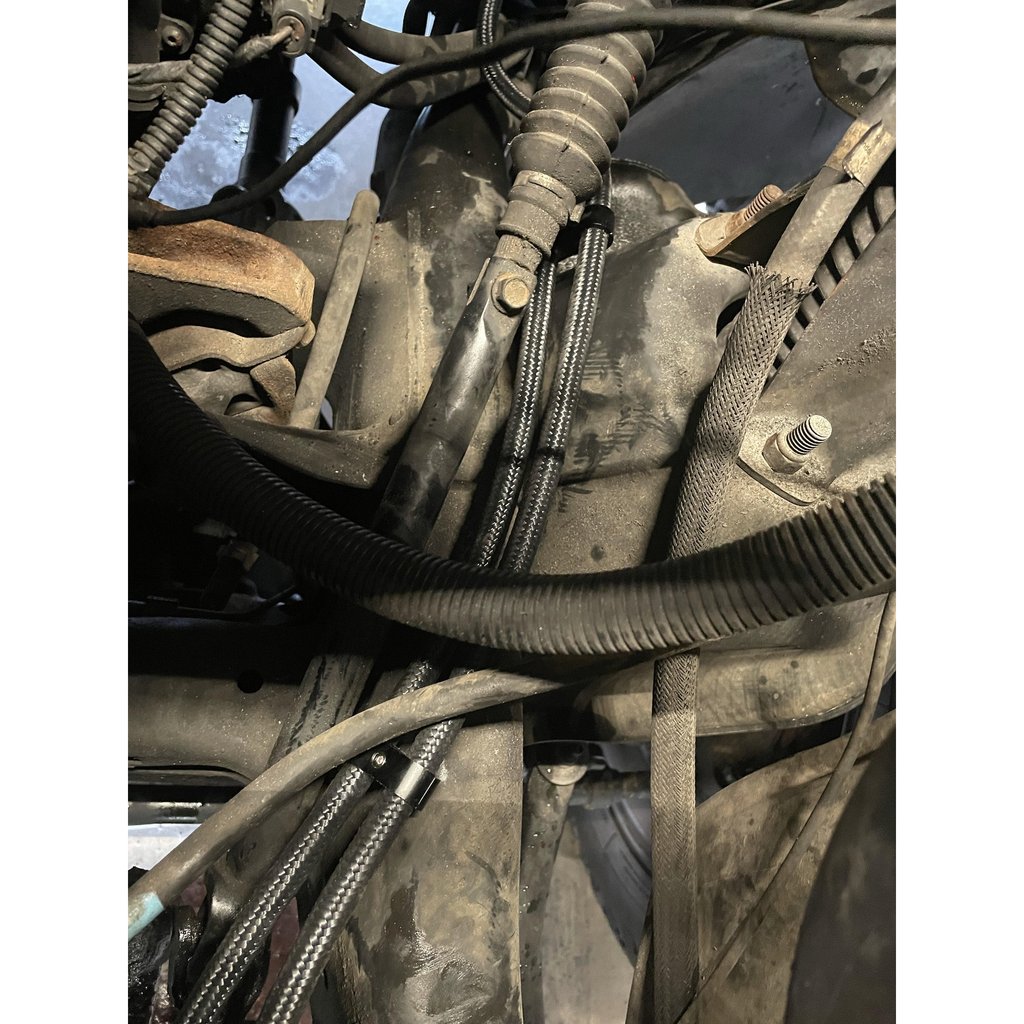 Replace your leaking Powersteering lines and clean up your engine bay with Full Send Diesels Powersteering hose kit. Our kit is made from high pressure PTFE black braided AN hose and forged AN hose ends. Not only will this kit replace your factory lines that may be leaking, but it also reroutes them down to the frame rail to add a custom look to your engine bay.