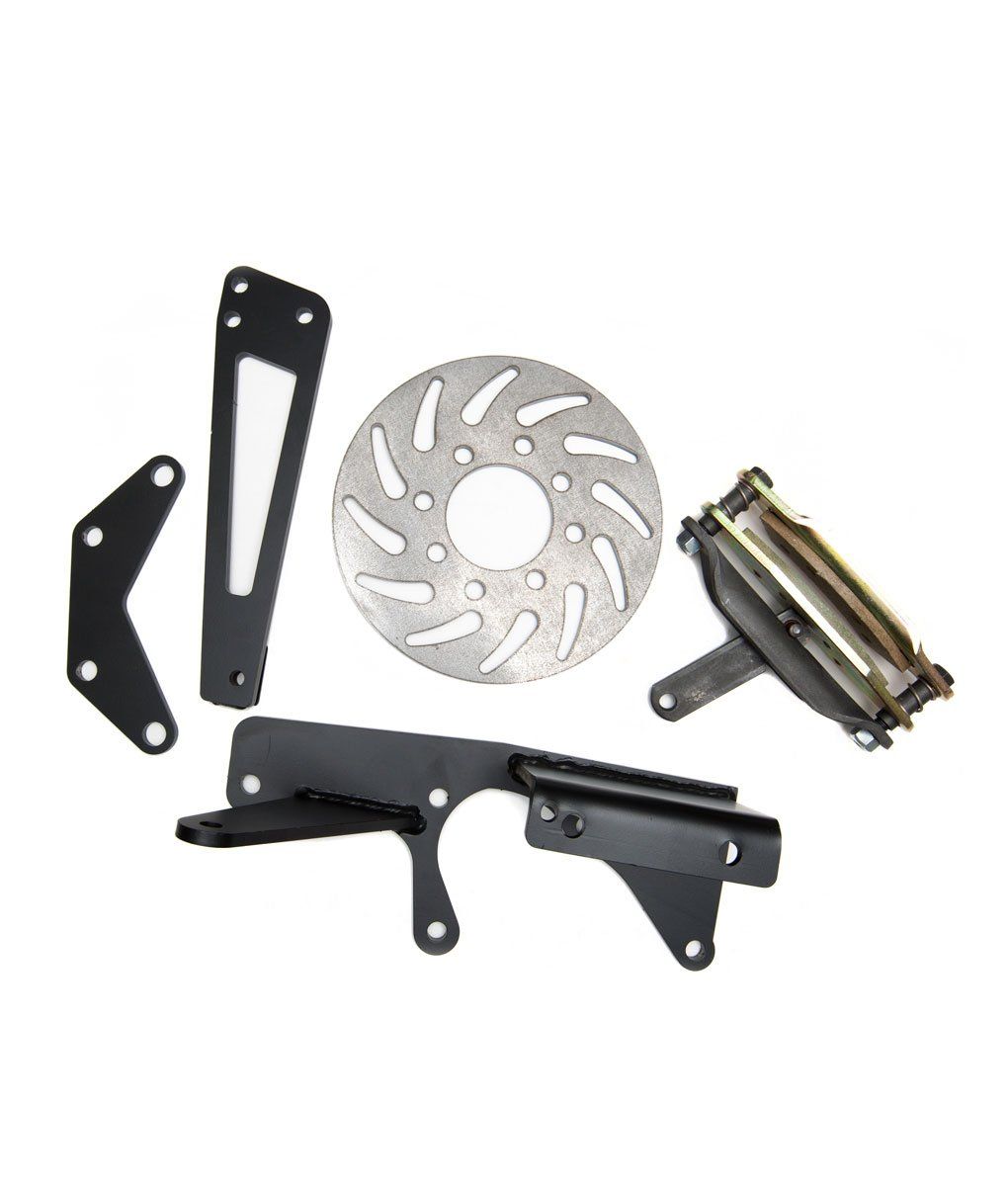 Simply bolt the kit onto the back of the transfer case with no driveshaft modifications needed. It fits 84-95 gear drive 4cyl transfer case equipped pickups and 4Runners (V6 and automatic applications are not available) and can be used with drum or disc rear brakes. The caliper and rotor are available separately for the those interested in building their own setup.