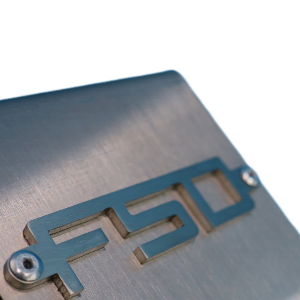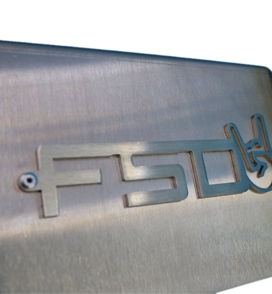 There is an FSD logo on each side with 2 rivets holes so they can be removed to be polished or powdercoated. Cut outs on the drivers side of the cover allow you to check brake fluid level and plug in the brake fluid level sensor. Billet brake fluid reservoir cap covers sold separately.