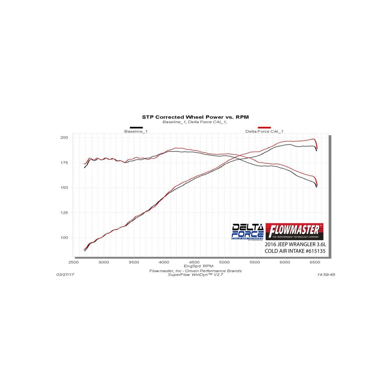 Take the performance of your vehicle to the next level with the addition of Flowmaster's new Delta Force Performance Air Intake system for 2012-2018 Jeep Wrangler (2 & 4 doors) with 3.6L engine. The Delta Force system contains an ultra-trick looking, custom molded black Cross-Linked Polyethylene (XLPE) high-flow intake tube, black anodized aluminum fittings (when applicable), high quality reinforced silicone couplers and all stainless steel hardware.