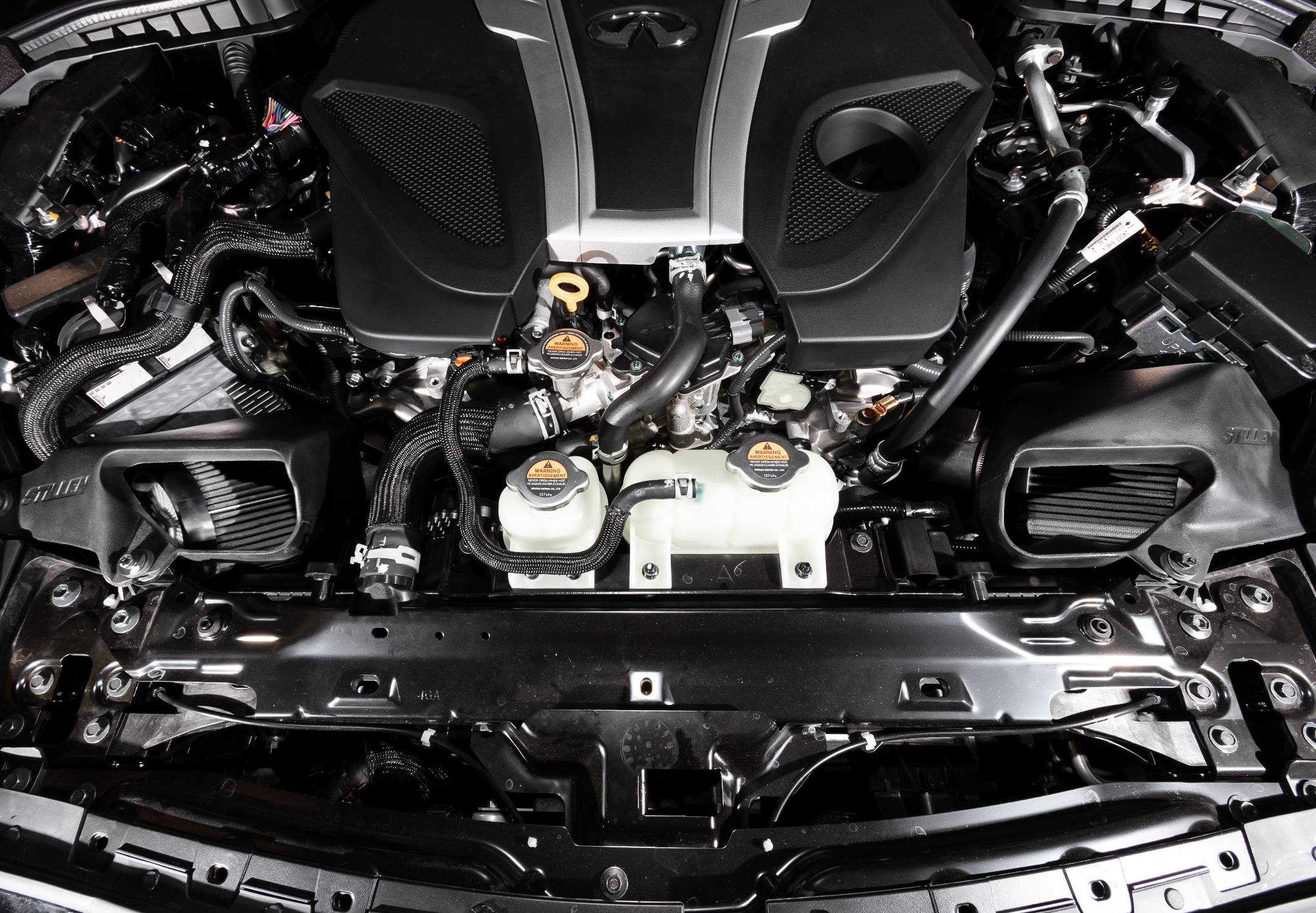 Featuring two custom molded urethane heat shields and air ducts, the STILLEN Hi-Flow Intake for Infiniti 3.0t engines is a true COLD AIR INTAKE - none of that 'warm air intake' nonsense you get when you just leave two filters exposed and unshielded under the hood. What really sets the 3.0TT apart from the non-turbo VQ cars that preceded it is just how big an impact the temperature of your incoming air charge makes.