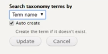 iii. Under any taxonomy field such as category or brands, after you save the source/target specs, they will be labeled as “Term name” under target configuration. You will want to click the gear under “Target Configuration” the same way you have to when specifying a unique sku, and make sure the dropdown is on Term Name, and Auto create is checked, then click update.