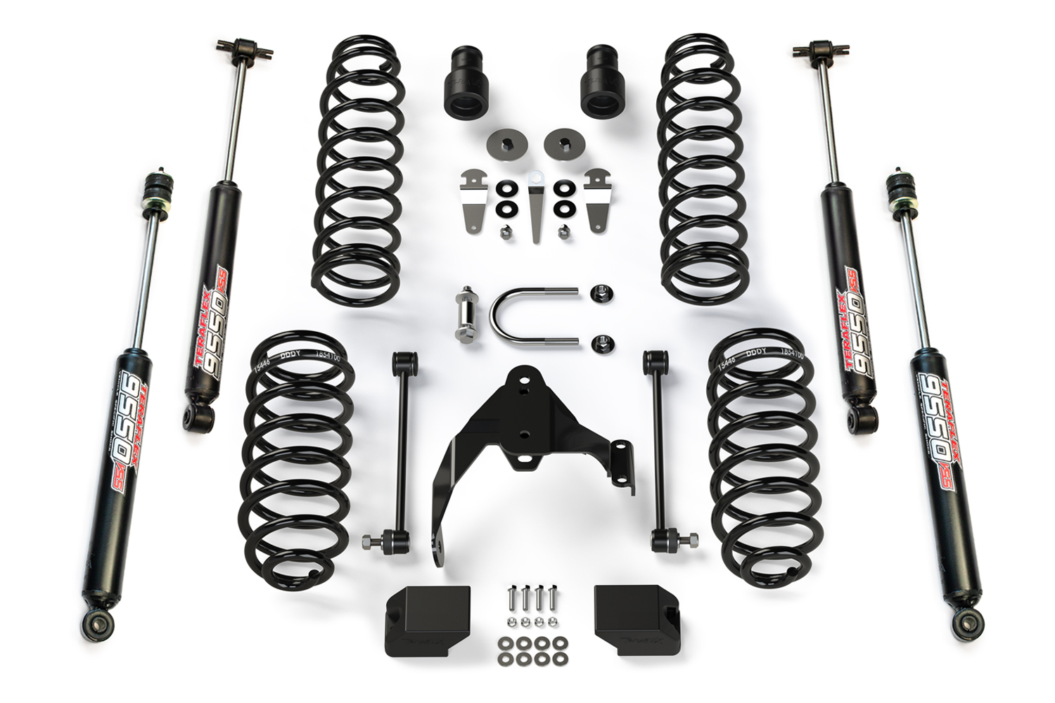 2.5 Inch Coil Spring Base Lift Kits are offered with TeraFlex 9550 VSS Twin-Tube Shocks, with shock extensions, or without shock absorbers or extensions.