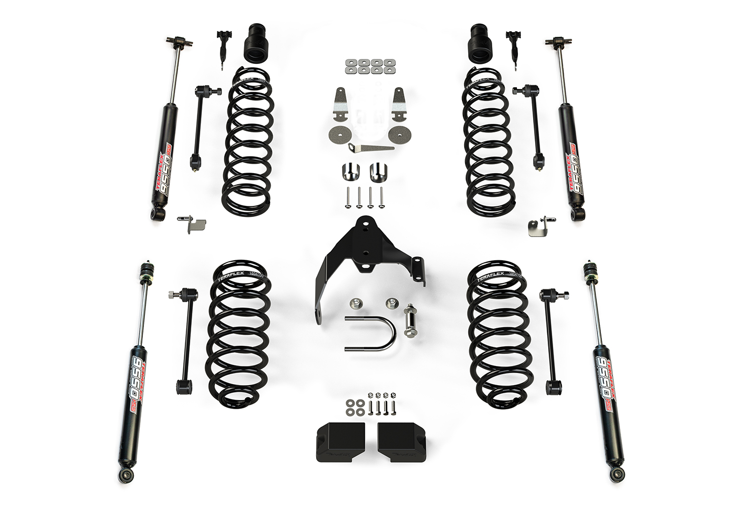 The TeraFlex JK 4dr: 3 Inch Coil Spring Base Lift Kit includes just the basic lift components only and doesn't have the drivability of a full suspension system.