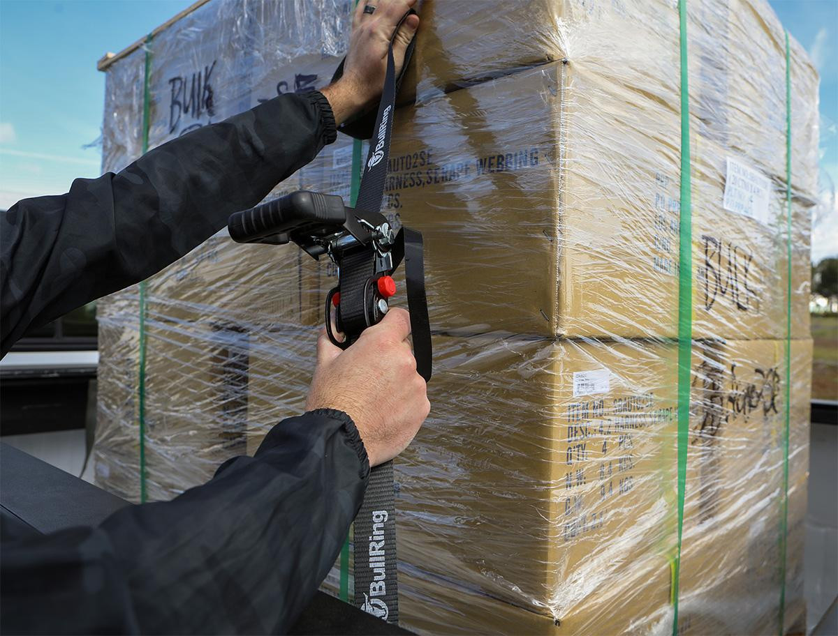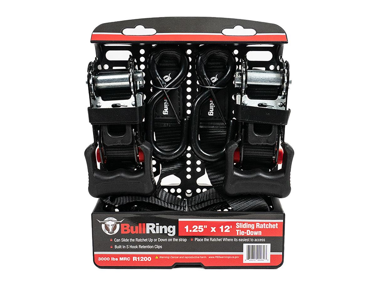 BullRing's 1.25 Inch x 12 Foot Sliding Ratchet Tie Downs make securing cargo on your truck or trailer quick and easy. A common issue with ratchet straps can be hard to access and tighten. Think of the last time you tried to ratchet something down in a truck bed when it was completely full. The ratchet handle is still stuck down low in the bed where you can barely reach it.