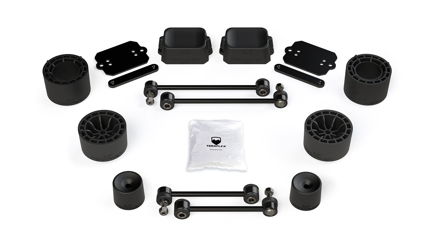 The TeraFlex JL 4dr Rubicon: 2.5 Inch Performance Spacer Lift Kit is the most economical way to fit larger tires and increase ground clearance on your JL Wrangler Unlimited Rubicon with the least amount of modifications.