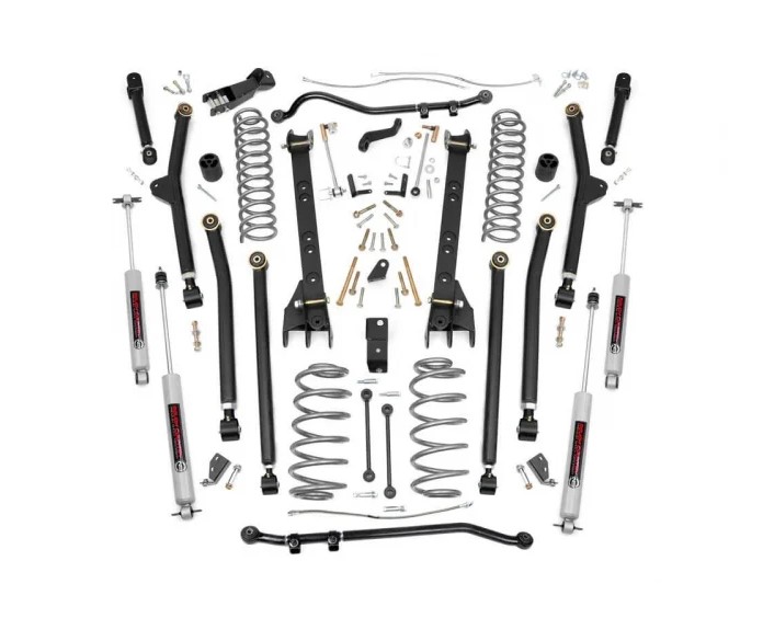 - Rear Components Lifted high flex coil springs Upper adjustable control arms Lower adjustable control arms Extended sway-bar links Forged adjustable track bar Stainless steel braided brake line Bumpstop extensions Hardware