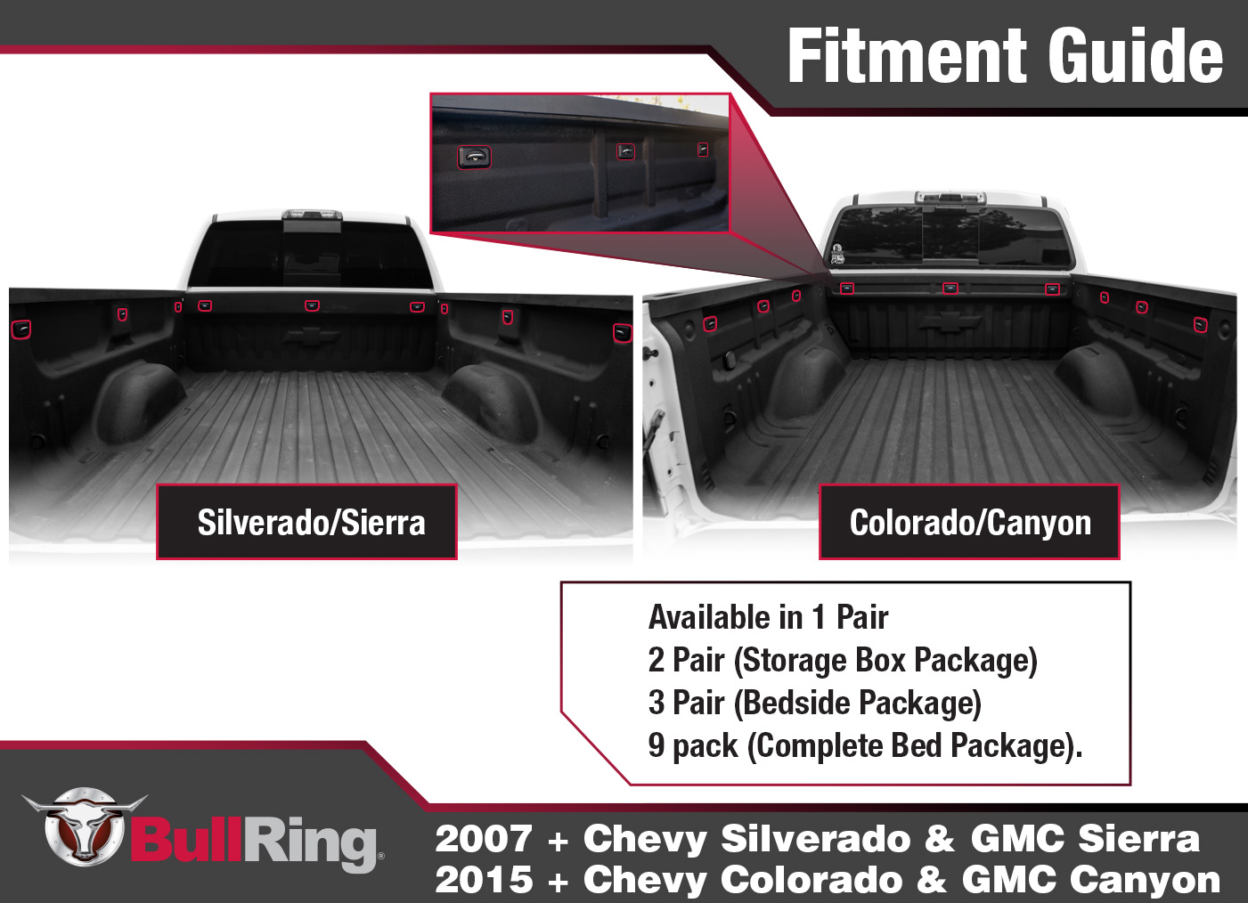 Bull Ring's are the premium tie-down anchor point for your truck. Our retractable bullet anchor points easily install into the 9 pockets that line the walls of Chevy and GMC truck beds. Installation is easy - No drilling, no special tools and no hassles.