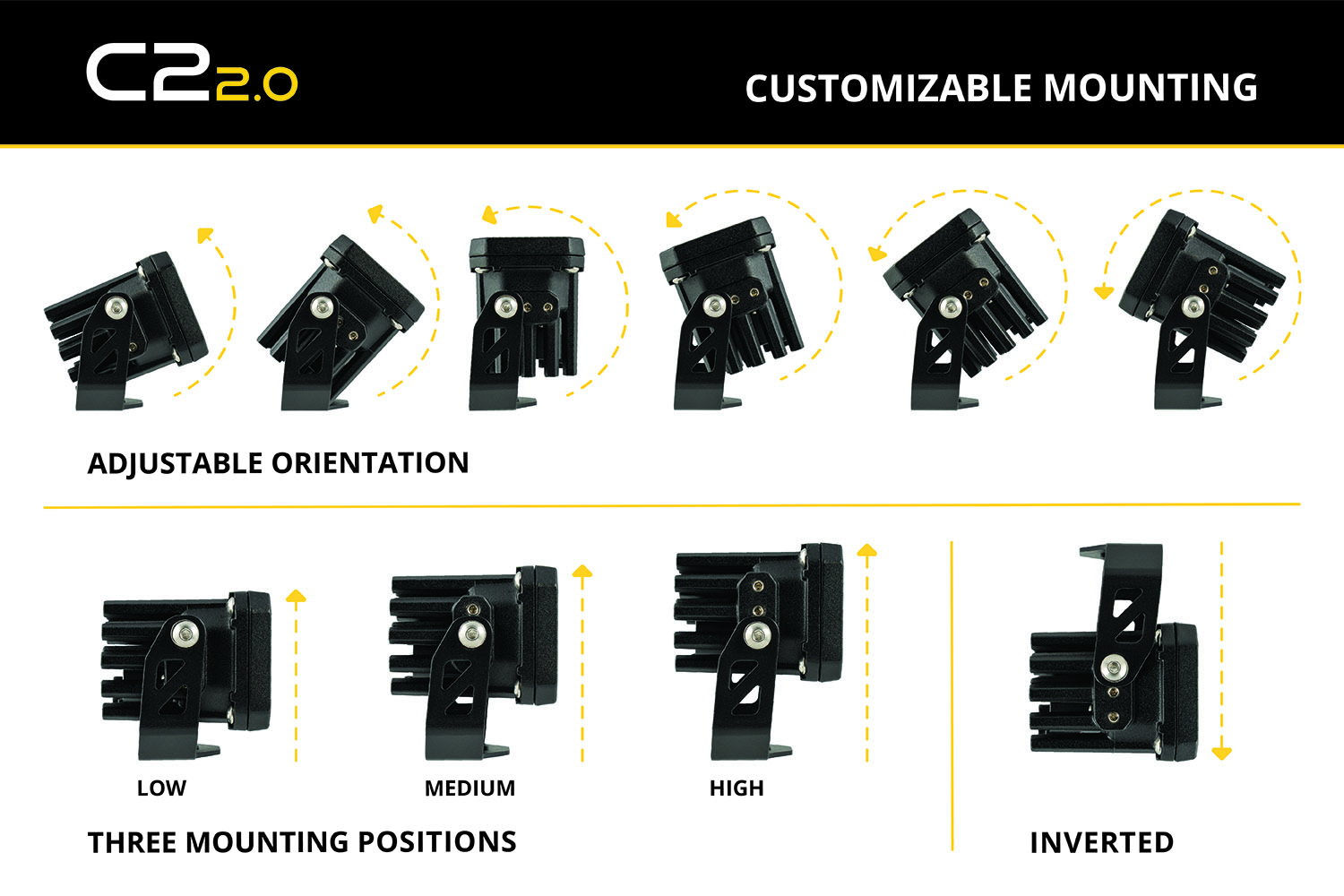 Customizable Mounting. The C2 2.0 LED pod features three mounting points to adjust the pods height. The revised mounting bracket also allows for even more adjustment to the angle of the pod for a more dialed-in setup.