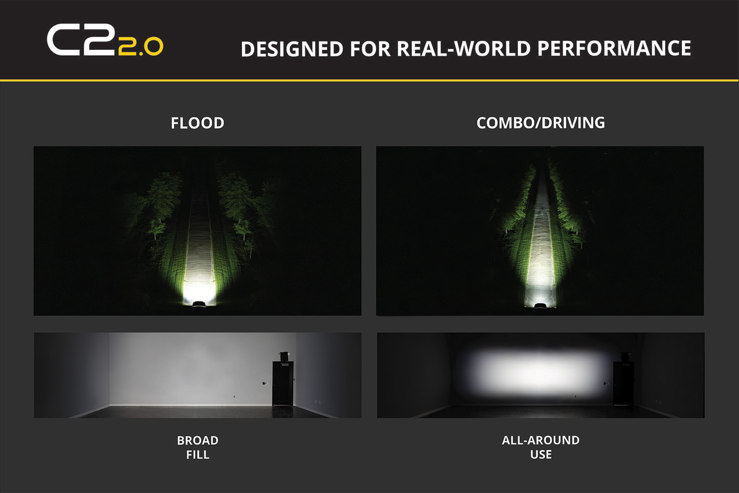 Focused Performance. Our patented TIR (Total Internal Reflection) optics in the C2 2.0 have been re-engineered for up to 120 percent more intensity and more usable light output compared to the C2 1.0. The TIR optics harness all of the light from the LED and direct it precisely where you need it. Each beam pattern has been fine-tuned for real-world conditions to perform even better than before.