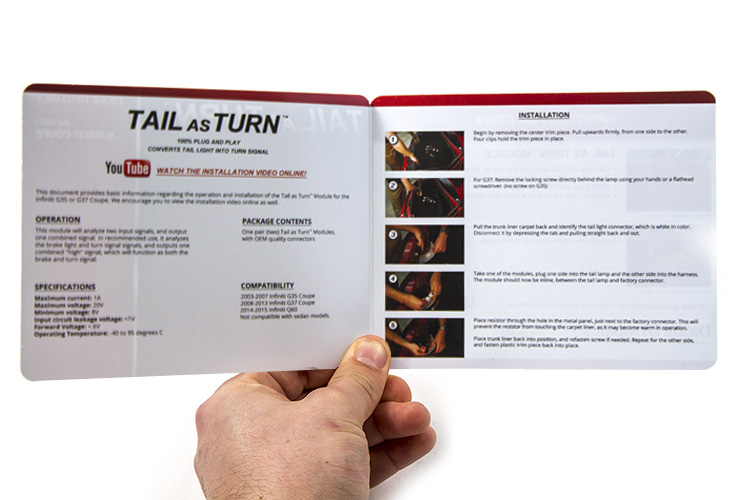 Custom Appearance. This kit will convert the LED tail light on your 2008-2016 Infiniti G37 Coupe to also function as the turn signal. This kit will instantly customize your vehicle for a much more modern appearance on the road! This module does not include the option to convert your old turn signal location into additional backup lights.