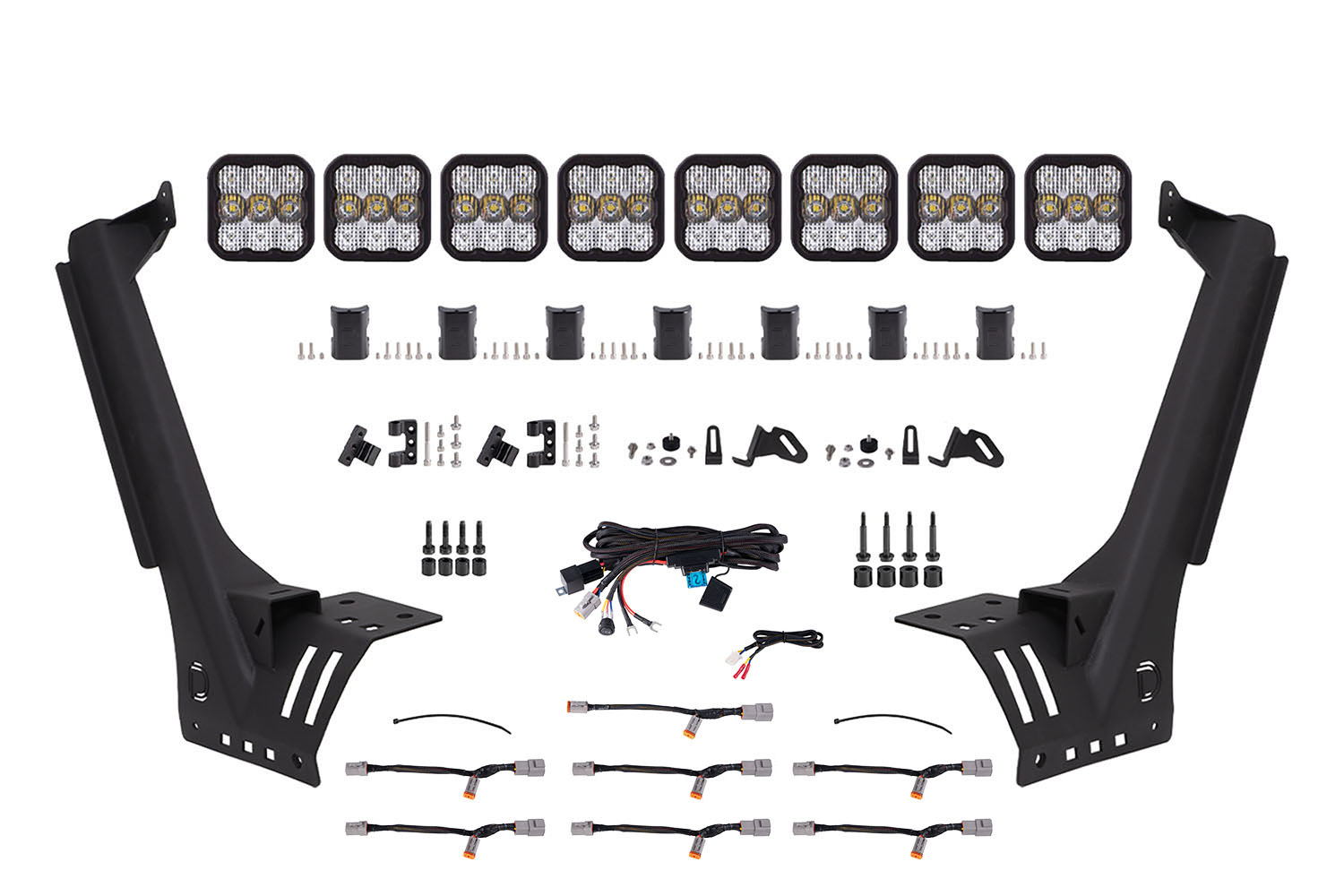 Perfect Fitment. The Windshield CrossLink Lightbar Kit compatible with Jeep JL Wrangler 2018-2021 from Diode Dynamics allows you to mount eight linked SS5 LED pods above the factory windshield. These application-specific brackets were CAD-designed to bolt into place using factory mounting points above the factory windshield. No cutting or drilling required!