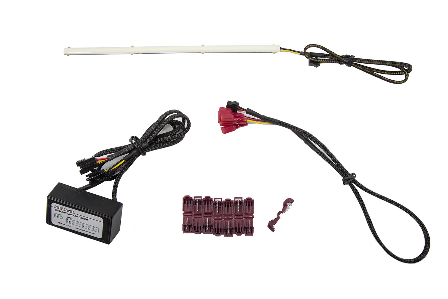 Wiring: All wires have a durable braided wire covering. The LED has a 20-inch wire with female JST type connector. This connector may be de-pinned in order to run wires through small holes during installation. Both the input and output wire on the driver are also 20 inches each. A pigtail is included that is also 20 inches, with male spade connectors on the end to connect to factory wiring with included T-taps. You will have plenty of room to run wires anywhere you'd like.