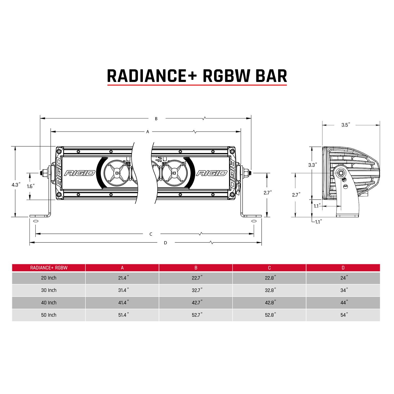 Available in 10, 20, 30, 40, and 50 Inch sizes, the Radiance Plus RGBW Lights Bars take the customization of your vehicle to the next level. Own The Night in style with Radiance Plus RBGW lighting.
