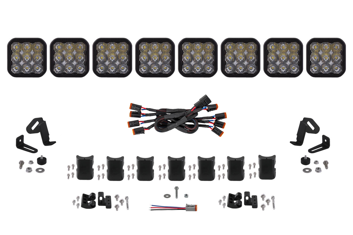 Simple connections. All SS5 LED pods feature a custom-molded DT type Deutsch-style connector on the back. DT splitters are included in the kit to connect the pods together along with a 6-inch pigtail with bare leads. For installation you can wire yourself use an off-the-shelf Deutsch DT sized wire harness or select the optional Diode Dynamics wire harness.