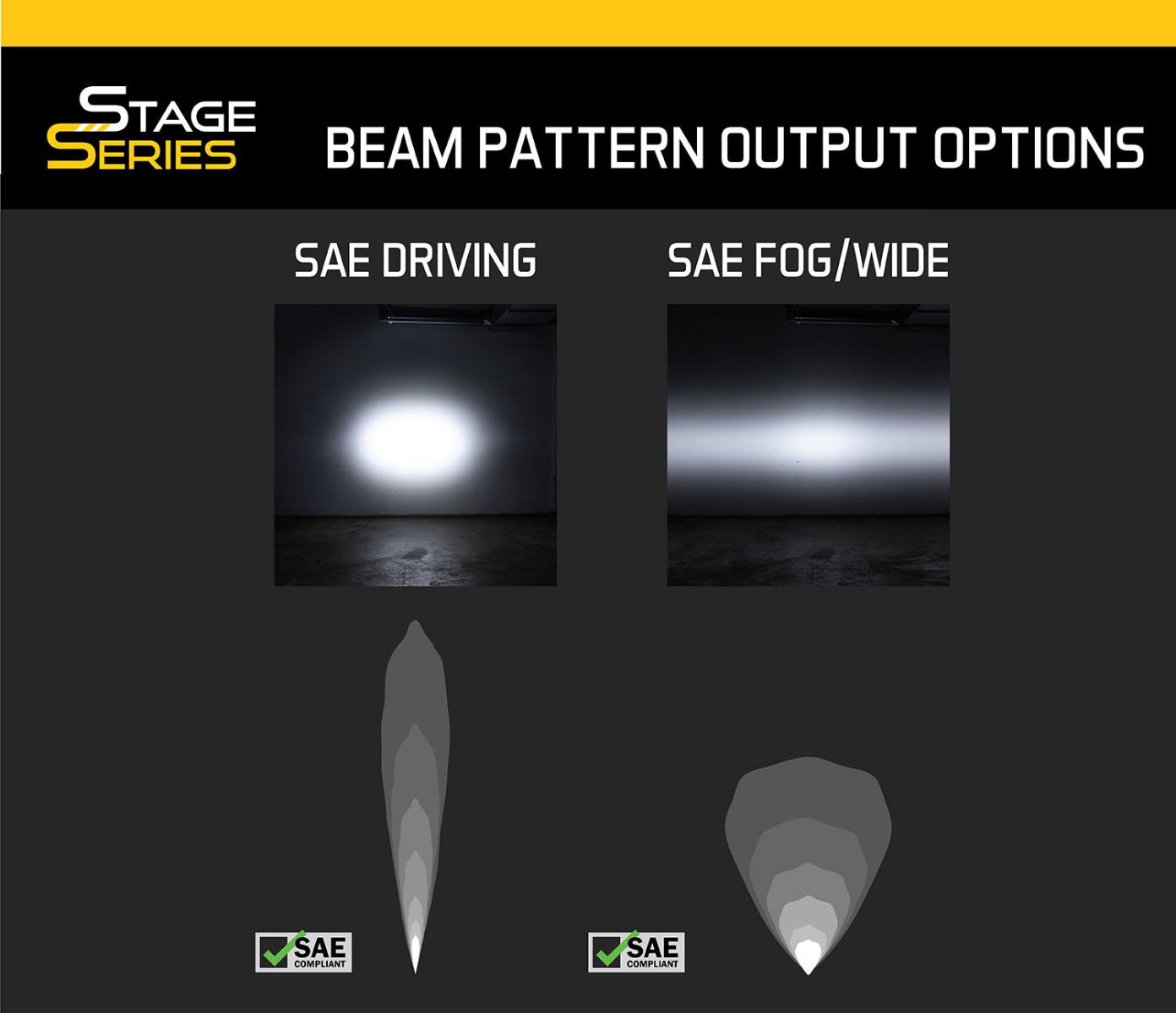 The Driving pattern was designed to supplement your high beams. Rather than a simple spot pattern the Stage Series Driving pattern has a rectangular 20Wx8H degree pattern that is far more useful for directing light downrange at high speeds.