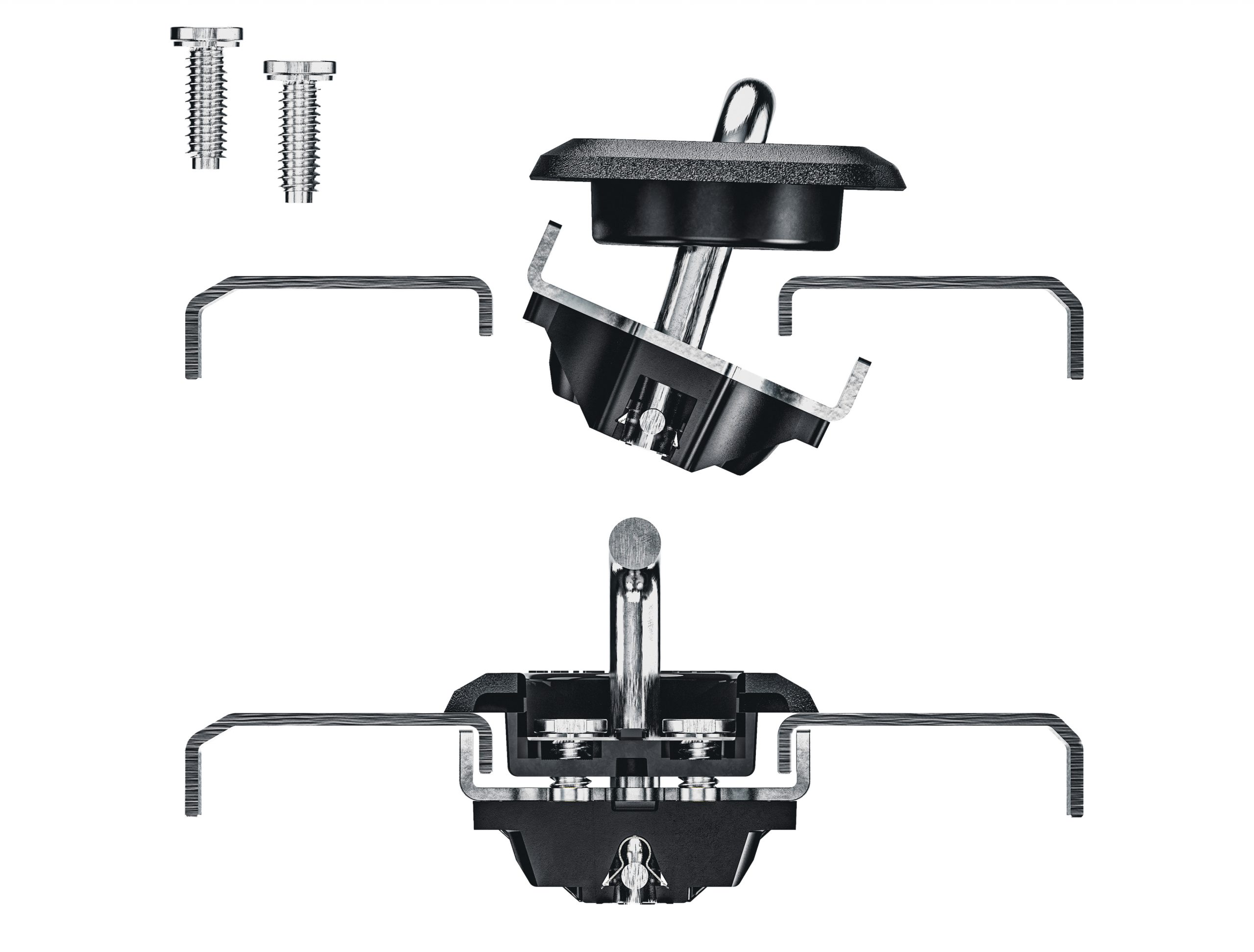 Pull the anchor ring up, so that the steel plate catches on the metal rail cap below, and tighten down the Phillips screws until they are hand tight (if the plastic railcap is starting to bending/bowing - then it's too tight).