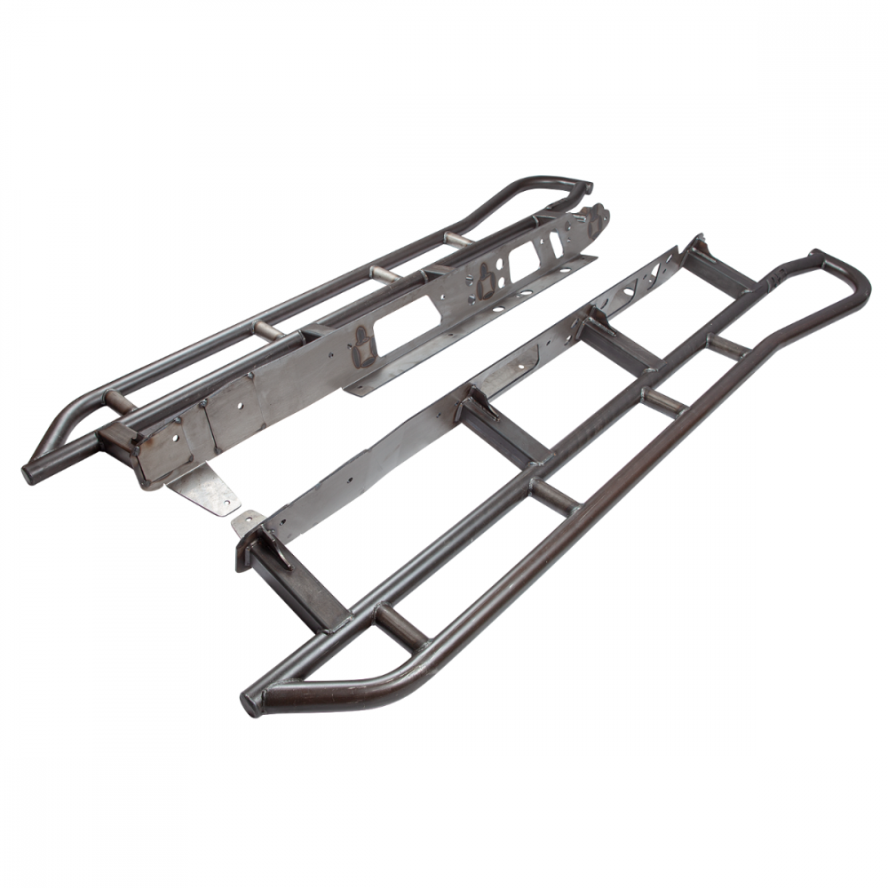 All-Pro Rock Sliders are made from heavy duty 1.75 x .120 Inch Steel Tube. Our sliders feature an innovative, one-piece mounting plate that runs down the frame, adding support to the weaker C-channel portion of the Tacoma?s frame while allowing for an easier bolt-on installation. Rock Sliders mount with the included grade 8 hardware including countersunk bolts that are flush with the bottom surface, since exposed bolt heads can be easily mangled by rocks. Pinch flange notching may be required due to slight variations between vehicles, and minimal drilling is needed for proper installation.