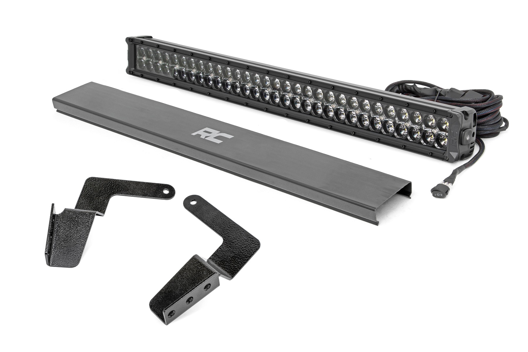 This kit includes a Rough Country 30-inch CREE LED Light Bar, featuring a durable, die-cast aluminum housing that offers incredible protection while the IP67 Waterproof design wards off mud, water, and dust. The included mounts provide a clean, flush look that blends in so well you'll never see an FJ bumper the same way!